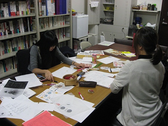 皆でワイワイ!ガヤガヤ! 意見が飛び交ってます! 編集会議はお菓子を食べ ながらの楽しい時間です〜 |