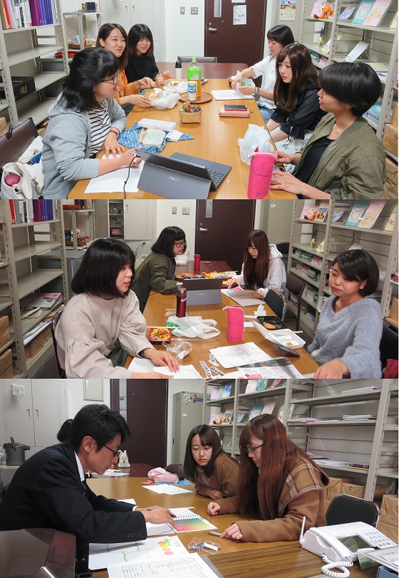 学年の区別なく、皆で意見を出し合って 構想をあたためます! PC画面で編集案を確認します! 印刷会社の担当者と入念に 色合いや・色調をうちあわせします〜 |