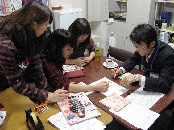 学生編集委員のコンセプトを印刷屋さんに伝えています! タウン誌を参考に色や太さなど細かく注文しています。 |